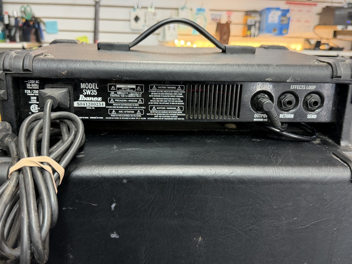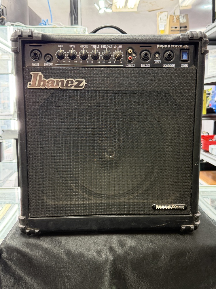 Music Gear Amps Ibanez Soundwave 35 Bass Amp The Ibanez SW35 SoundWave 35w Bass Combo is a 35-watt bass amp that is a good choice for practice or rehearsal. It has a 10-inch speaker and a tilt-back, closed-back design. It has a looper and distortion effect, and can be used with a guitar or bass